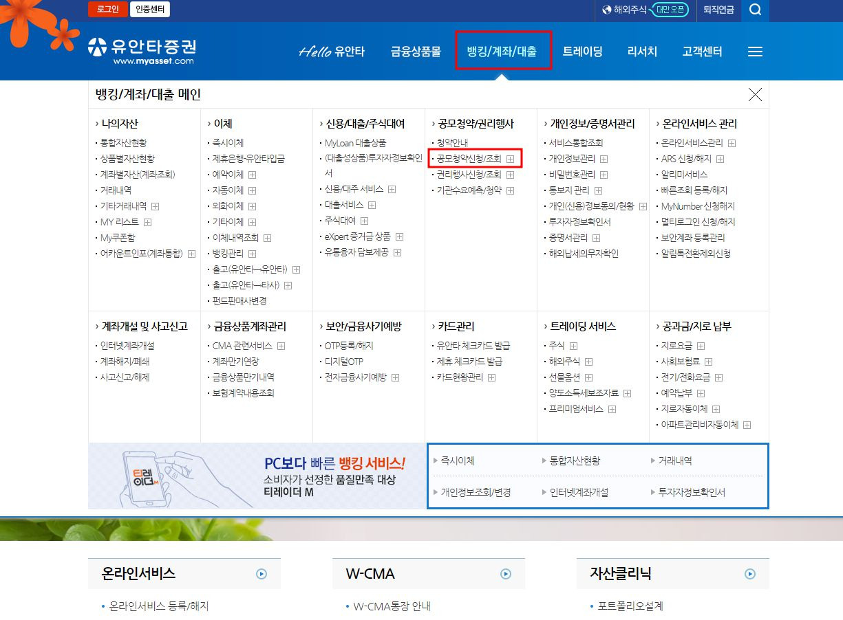 유안타증권 홈페이지에서 유안타스팩14호 공모주 청약하는 방법은 유안타증권 홈페이지 접속 후 상단의 ‘뱅킹/계좌/대출’ – ‘공모청약신청/조회’ 메뉴를 통해 신청할 수 있습니다.