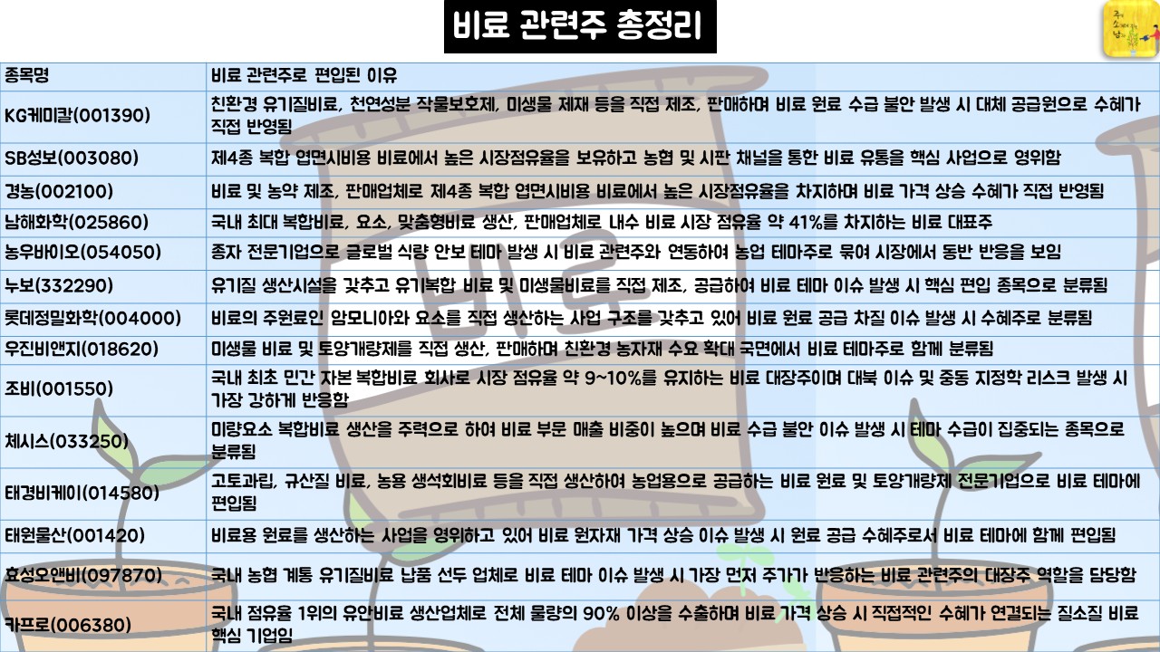 비료 관련주도 같은 맥락에서 이해할 수 있습니다. 조비, 남해화학, 누보, 효성오앤비, 한일사료, 우성오에스피 등이 강세를 기록했는데, 이란 사태로 인한 비료 원재료 수급 불안정 우려가 그 배경입니다. 에너지 공급망이 흔들리면 비료 생산 원가까지 연쇄적으로 영향을 받습니다. LPG 테마와 비료 테마, 뿌리는 하나입니다.